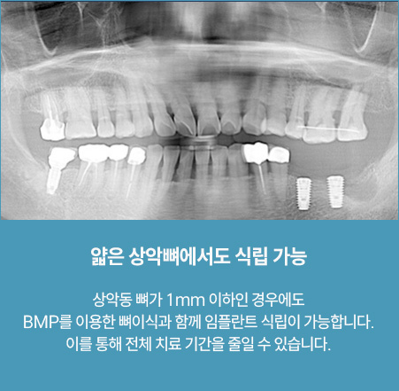 자가 조직으로 부족한 잇몸뼈를 재건하면 임플란트 시술이 가능합니다. BMP(Bone Morphogenic Protein, 골형성유도단백질)는 단백질과 콜라겐을 이용해 새로운 뼈 형성을 돕는 물질로, 다양한 뼈 이식 시술에 활용되고 있습니다. 이를 통해 해면골과 치밀골까지 재생이 가능해, 안정적인 잇몸뼈 재건과 임플란트 식립에 도움을 줍니다.
