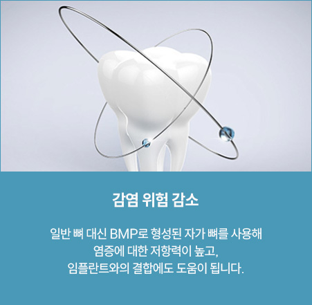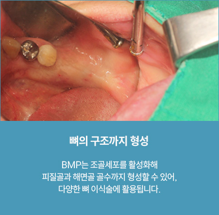 BMP(Bone Morphogenic Protein, 골형성유도단백질)는 단백질과 콜라겐을 이용해 새로운 뼈 형성을 돕는 물질로, 다양한 뼈 이식 시술에 활용되고 있습니다.